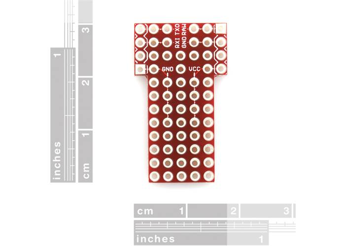 This is a small prototyping shield for the Arduino Pro Mini. If your project requires just a little bit more space for your external circuitry, this might be a perfect addition. 38 unconnected PTHs are provided for your prototyping needs.