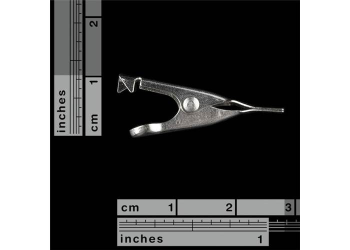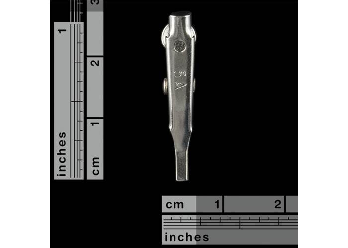 These alligator clips are useful for smaller wires that you don’t want to deform. The clip has smooth flat metal blades that clamp down on the wire, making for a good connection to thinner wires. There are strain relief crimp points and a solder hole at the end of the clip.