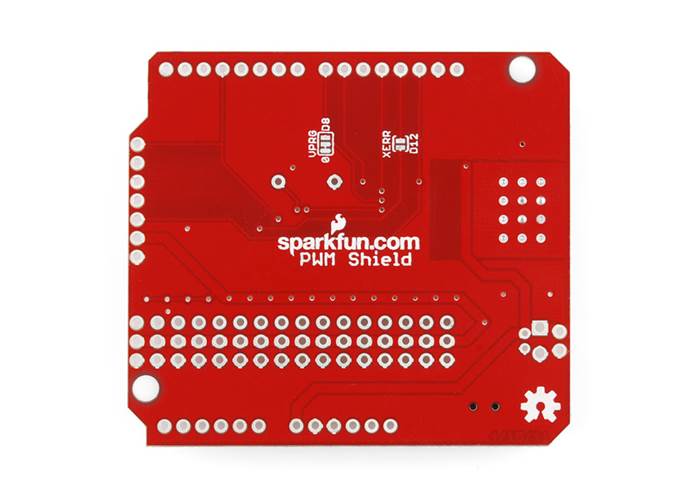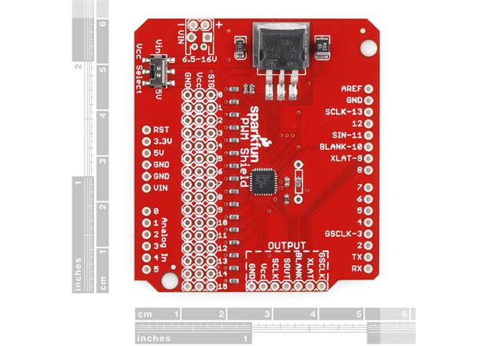 This is the Arduino shield version of our TLC5940 Breakout. The SparkFun PWM Shield will allow you to generate up to 16 PWM signals from your Arduino by utilising the power of the TLC5940 IC. All 16 PWM channels are broken out to standard 0.1" headers, which run alongside convenient voltage and ground rails. Because the IC can be daisy-chained, output headers are broken out on one side of the shield and can be connected to our TLC5940 Breakout to further expand your PWM capabilities.