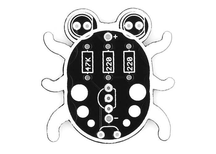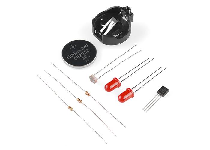 The WeevilEye is a through-hole soldering kit designed for the beginner. It has a low parts count so even young kids can easily complete it. Once it’s put together the red LED “eyes” light up brighter or darker according to how much light is getting to the photosensor.