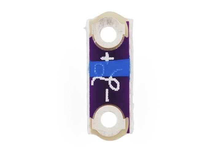 Note: Because the board don’t include a current-limiting resistor, it is possible to over-power them and possibly burn them up. The high resistance of conductive thread can help protect the Micros from high current, so long stitches can be used with most power sources to keep the power levels ‘Micro-friendly’. If you aren’t sure where to start with resistance and current, using these in conjunction with a LilyPad Simple or Main Board is a great place to start, because they both have built-in current limiting and can’t burn up your Micros.