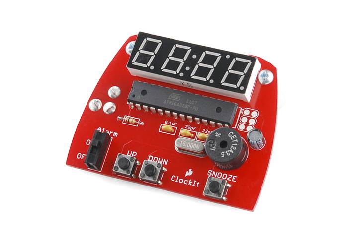 This is a great kit to learn the basics of soldering. The SparkFun ClockIt is a basic alarm clock with buzzer based on the ever popular ATMega328. If you’re just learning how to solder, this kit should take you 15-20 minutes.