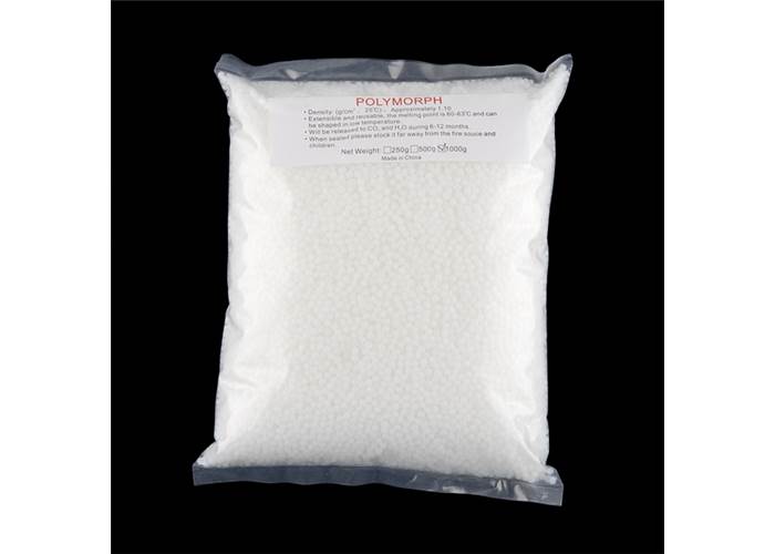 Polymorph is a non-toxic, biodegradable polyester with a low melting temperature of about 60°C (140°F). Prototype plastic parts can be made by simply heating the plastic beads in hot water until they turn clear and then kneading them together and shaping by hand. When it cools it becomes a nylon-like white plastic. Polymorph can be re-used by simply re-heating and re-shaping. Plastic beads are supplied in a re-usable plastic container.