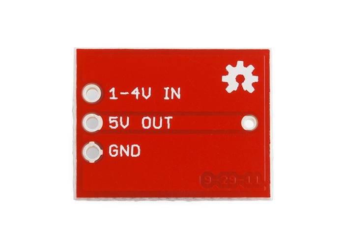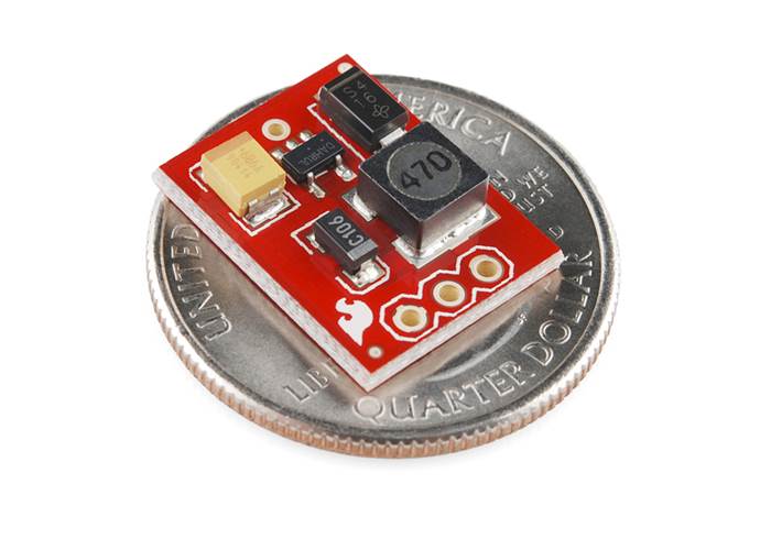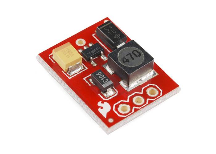 The NCP1402 is a 5V DC-DC converter. This breakout board will accept voltage inputs between 1 and 4 Volts and output a constant, low ripple 5V output capable of sourcing up to 200 mA. This board is great for supplying power to 5V sensors on a 3.3V board, or providing 5V from a AA battery.