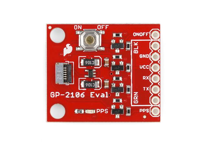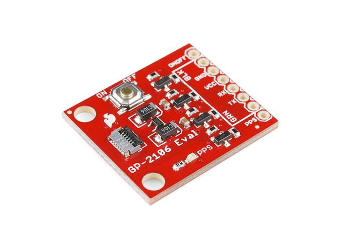 The GP-2106 Evaluation Board features everything you need to get the GP-2106 module talking to your system. Because the GP-2106 is a 1.8V module, we’ve provided level-shifting for 3.3 and 5V systems. The board also features a PPS status LED, on/off button and an FTDI Basic compatible header!