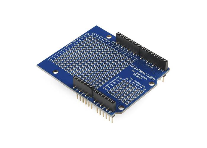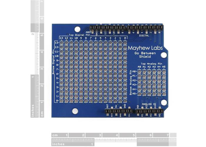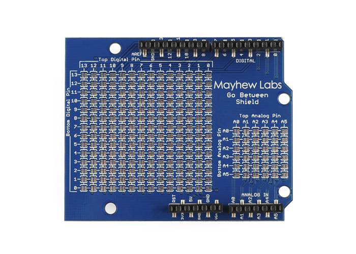 You hear it all the time in the Arduino community, “will this shield work with my other shield?.” I think we’ve all been disappointed to find that two of our favourite shields compete for control of a digital pin here or a serial pin there. While there are sometimes some clever workarounds from elegant code modifications to aggressive ‘greenwiring,’ Mayhew Labs may have come up with the simplest solution thus far: The Go-Between Shield.