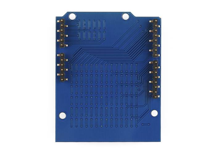 The Go-Between Shield “goes between” two shields that aren’t compatible and effectively reassigns the pins. This trickery is achieved by isolating the top and bottom sides of the shield with surface mount headers and breaking them out into tables of jumpers that can be bridged to divert signals to and from different pins. For instance: If you have two shields that require use of pin A1, you can simply close the correct jumper and stack the Go-Between shield between the two conflicting shields. Now the shield above the Go-Between will think it’s using A1 when in reality it’s connected to the Arduino’s A0. Now your shields aren’t stepping on each others' feet, so to speak.