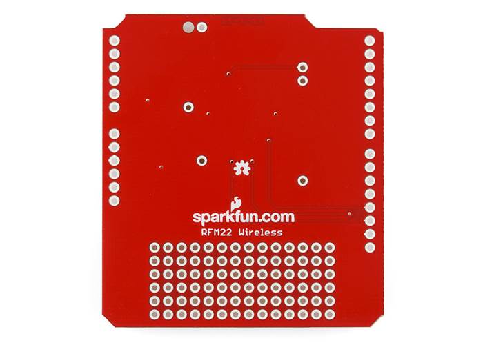 The shield has on-board power regulation and level shifting. There are one pin headers and jumpers on the interrupt (nIRQ), interface select (nSEL), shutdown input (SDN) and GPIO2 lines so that you can cut the trace and reroute those lines if you need to for your project. The board also provides a little bit of prototyping space.