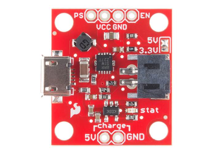 The micro-USB charger uses the MCP73831 and allows you to charge 3.7V LiPo cells at a rate of 100mA max. The reason for this is because the device does not request 500mA from the USB port and therefore it can only pull 100mA. If you want to charge at a faster rate, you will need to connect a separate power supply to the pins labelled ‘5V’ and ‘GND’ under the label ‘charge’.