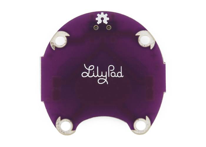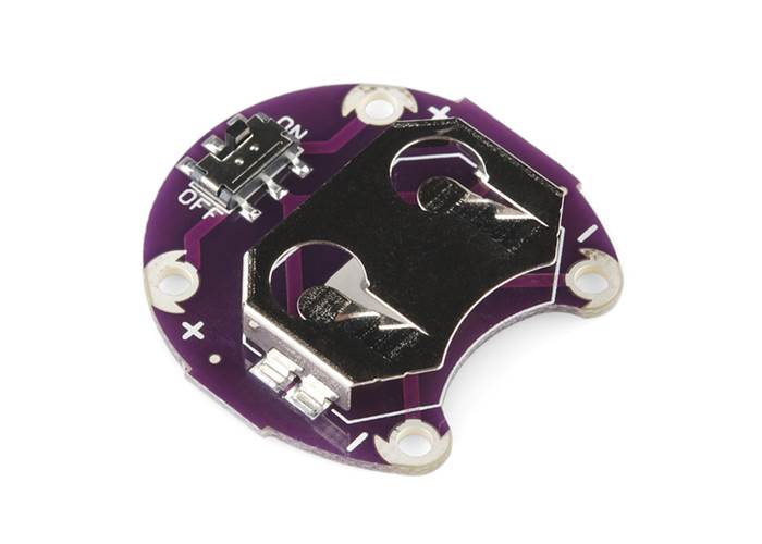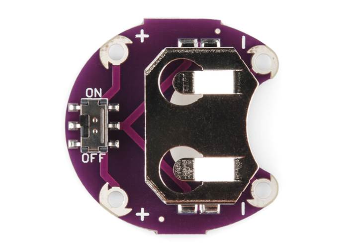 This LilyPad Coin Cell Battery Holder has a small slide switch installed on the board, in-line with the power so you can shut off your project and save batteries. This slide switch is the same as is found on the LilyPad slide switch board, so it’s not easy to accidentally turn off or on.
