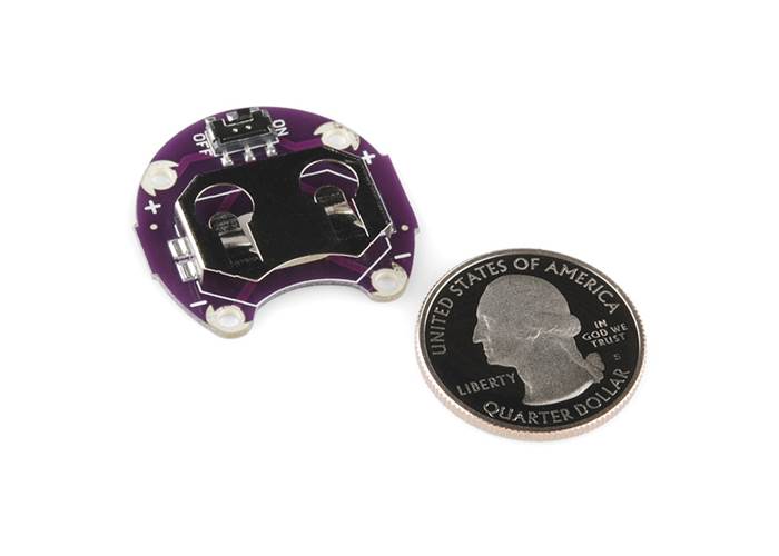 This LilyPad coin cell battery holder has a switch so you can turn on your creative masterpiece only when needed . The tiny slide switch is unobtrusive and easy to use and much easier than pulling a battery out.