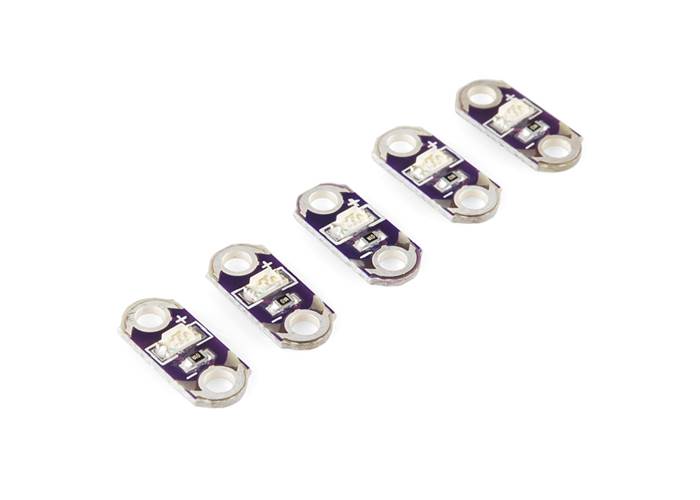 Note: The purple LED has a much higher voltage drop than other LilyPad LEDs so it will be dimmer than the others. What’s voltage drop? Click here and get your learn on!