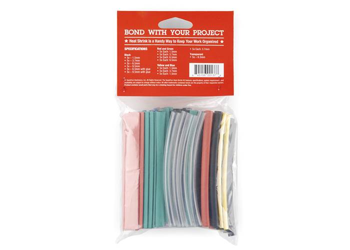 We love heat shrink! We use it for all sorts of handy projects. Use it to reinforce connections, protect devices, and electrically isolate exposed solder joints. We worked with a manufacturer to create a kit that we would use: lots of colors, lots of sizes, nothing too long. We specially requested some of the sizes with heat sensitive glue which significantly increases stress relief and water proofing. This kit includes 95 pieces of heat shrink, all of varying colors and sizes, and comes in a clear bag. All pieces are 10cm in length.