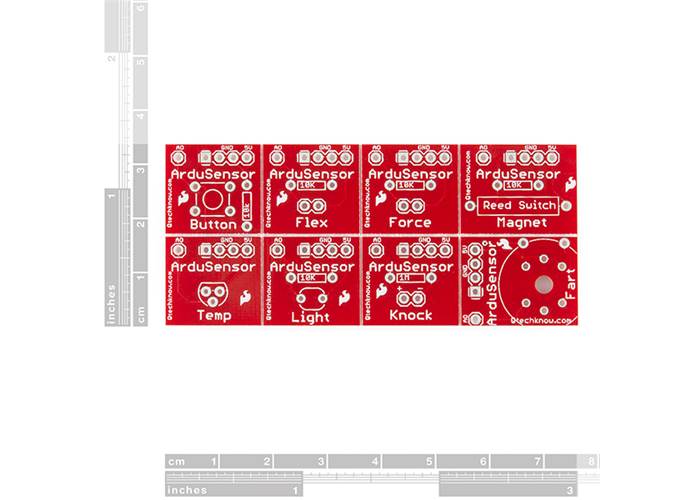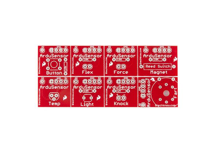 This kit boasts eight different types of sensors, including button, flex, force, magnet, temperature, light, knock, and (of course) fart. These sensors, once soldered, can easily be placed onto the ArduSensor Shield in one of four designated areas with readings from an RGB LED, a buzzer, and an LED bar graph relaying the information to you.