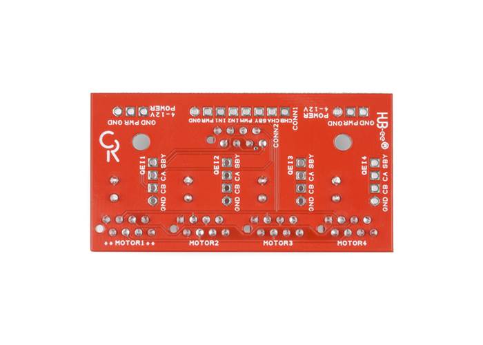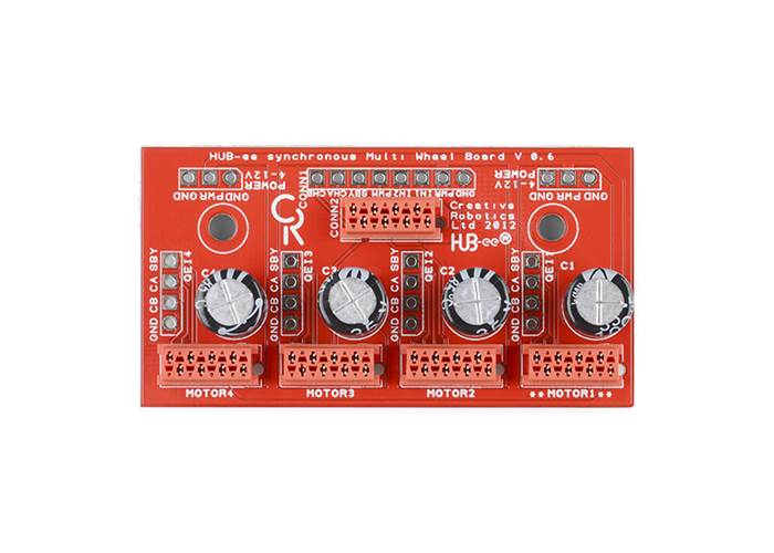This PCB lets you plug four HUB-ee wheels into one controller for synchronous drive (i.e. all the wheels plugged into this PCB will get the same control signals). It also isolates the quadrature encoder channels of each wheel and routes one set through to the controller whilst making all the quadrature and standby pins for each wheel available on pin headers.