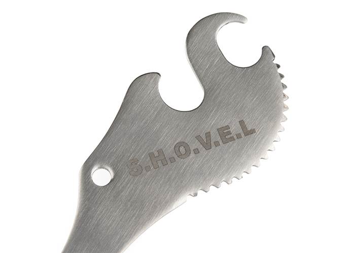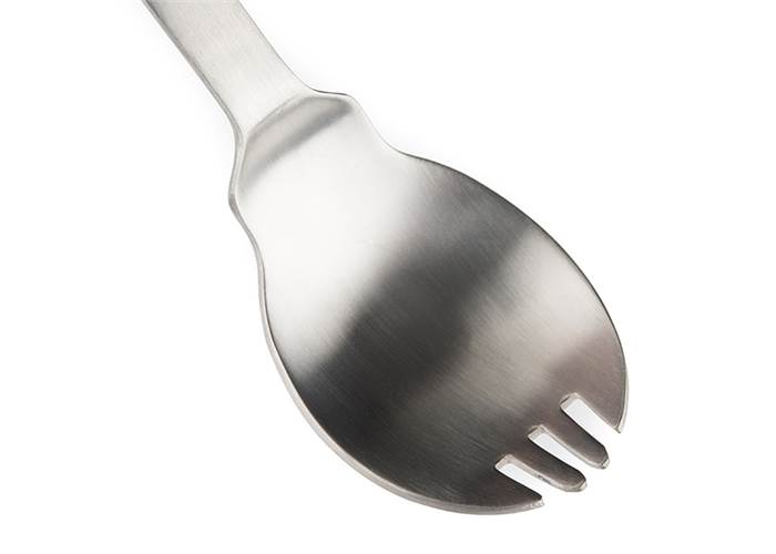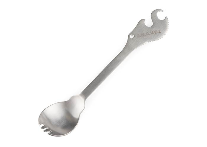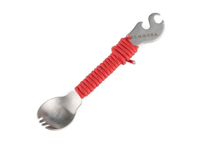 Introducing the Semi-Horned Oblong Versatile Eating Ladle, or as we like to call it, the S.H.O.V.E.L. This is not your run-of-the-mill spork (foon), ladies and gentlemen! It also has a serrated knife, a bottle cap opener, and six feet of red paracord to wrap around its sturdy titanium body.