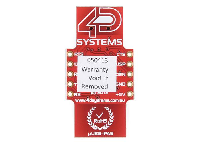 The microUSB Programming Adaptor (μUSB-PA5) is a USB to Serial-TTL UART bridge converter which is very small and easy to use. It uses a mini-B type USB connector to connect to your PC and is based on the FTDI FT232RQ USB to Serial Bridge IC from FTDI. The μUSB-PA5 allows you to communicate with 4D Systems' screens and controllers.