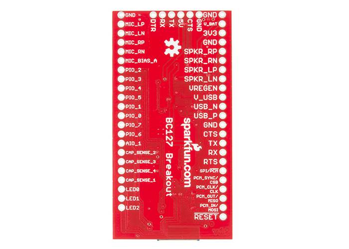 The BC127 Breakout board provides basic access to all the pins on the BC127 module, along with a six-pin serial header with the same pinout as the FTDI Basic boards, allowing it to connect to boards like the Arduino Pro, Pro Mini, and LilyPad. It also includes voltage regulation, serial data level shifting circuitry, and support for the built-in battery charge circuitry.