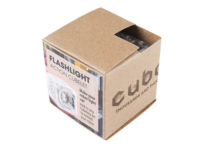 The Torch Cubelet emits a focused beam of light from a powerful white LED. The light becomes brighter with higher input values, and is off with a value of 0. Cubelets are magnetic blocks that can be snapped together to make an endless variety of robots.