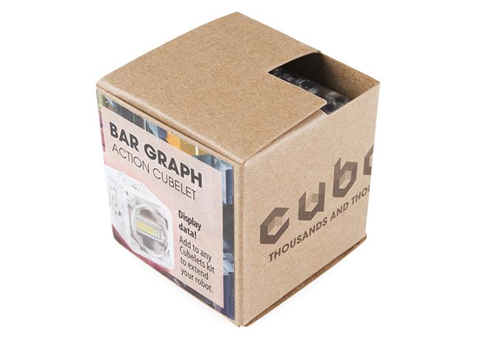 This cubelet displays the block’s value as a light-up bar graph. The value is normalised to the number of points on the bar graph so that a maximum value results in a fully-lit bar graph. Cubelets are magnetic blocks that can be snapped together to make an endless variety of robots.