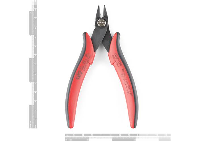 These are our new and improved flush cutters, giving you a way to cut leads very cleanly and close to the solder joint. Diagonal cutters are good, but if you really need to get up close and personal, flush cutters are the way to go. They have a nice spring-action and a comfy grip. Plus, the colour combination of red and black is fetching, I must say.