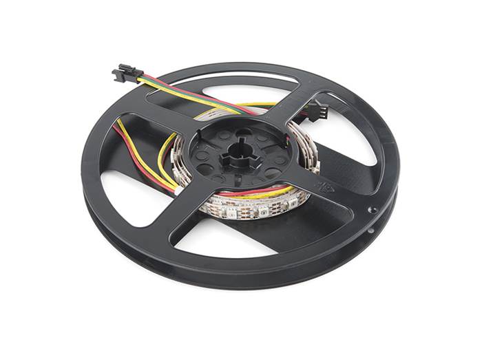 Note: These come in 1m segments on a reel. They are preterminated with 0.1" spaced 3-pin connectors as well as a 2 wire power connector, as shown in the pictures.