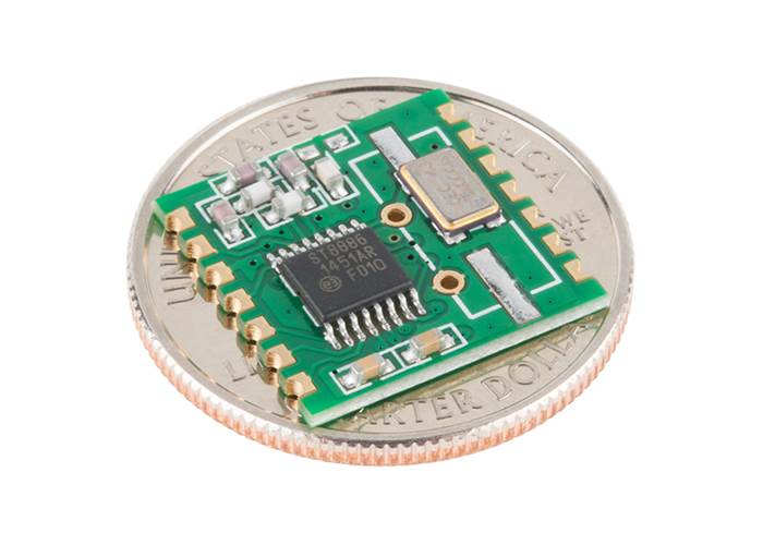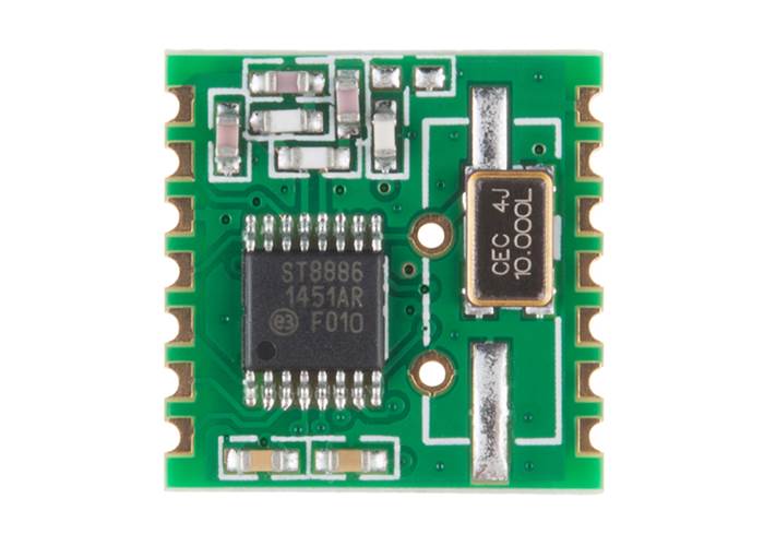 This module has a wide voltage supply range of 2.2-3.8VDC. An SPI interface is used to send data and configure the RFM12 module. The configuration commands, described in the RF12 IC Datasheet linked below, can be used to set the data rate, frequency band, wake-up timer, transfer data, receive data from the 16-bit FIFO, and much more.