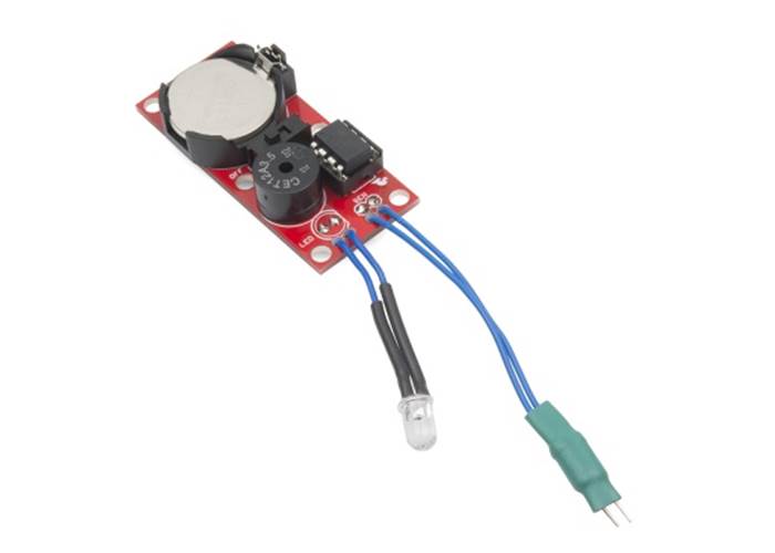 The SparkFun H2OhNo! is a water sensor alarm kit that you build yourself. When water is detected across the sense pins an alarm goes off and an LED starts blinking.