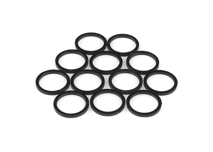 These plastic shaft spacers have an inner diameter of 1/2” and a thickness of 1/16”. These spacers are ideal for spacing out an area between a bearing and a shaft collar to reduce metal to metal contact.