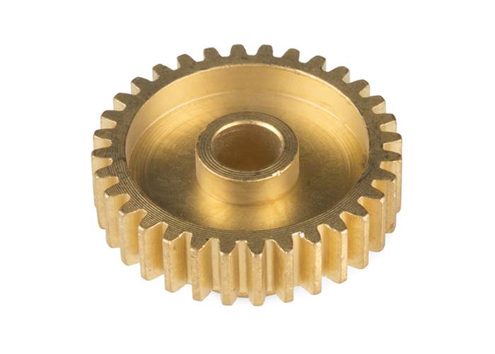 These pinion gears attach to a 6mm D-shaft or gear motor using a setscrew. These gears have 32 teeth with a gear pitch of 32P, an outer diameter of 1.063”, and a bore of 6mm.