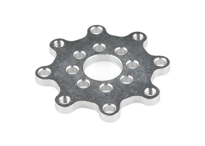 This hub adaptor lets you connect Actobotics parts with a 0.77" hub pattern to parts with a 1.5" hub pattern. The holes for the 1.5" pattern alternate between tapped and untapped, whereas the inner 0.77" hole pattern is all un-tapped.