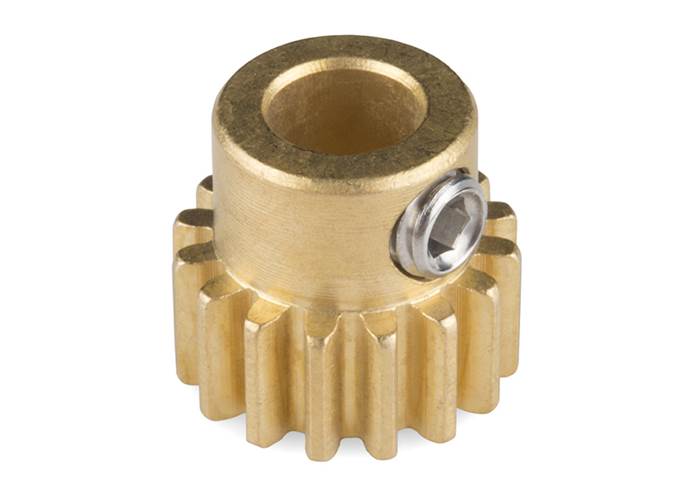 These pinion gears attach to a 6mm D-shaft or gear motor using a setscrew. These gears have 16 teeth with a gear pitch of 32P, an outer diameter of 0.563”, and a bore of 6mm.