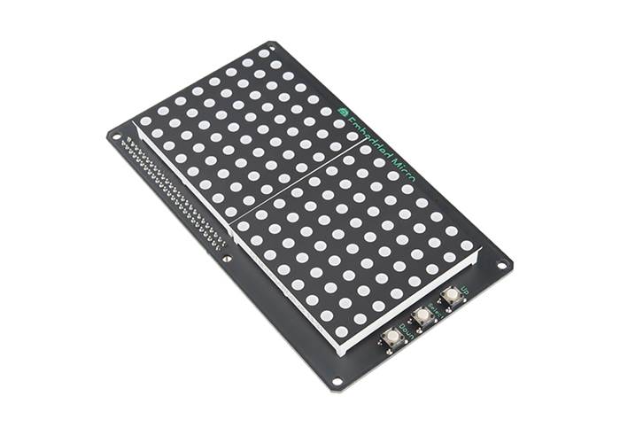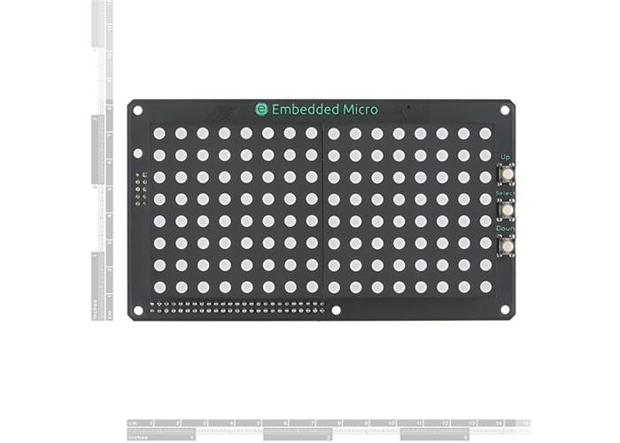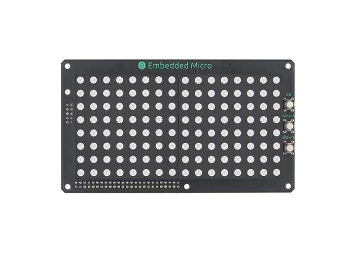 With the example design listed below this shield will quickly become a basic real-time clock. Setting the time is easy, just hold the select button until the hour flashes, using the up and down buttons to adjust the hour and select again to edit the minutes. Then you’re done, press select to set the time! Additionally, the light sensor attached to the shield is capable of detecting the ambient light levels to adjust how bright the RGB LED matrices get, that way you won’t have to worry about a plethora of colors bothering you while you try and sleep.