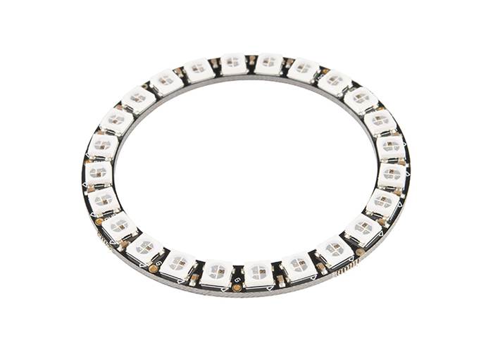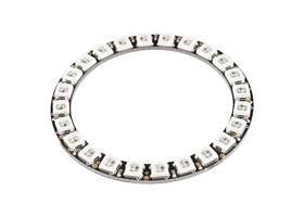 This is the 24 LED NeoPixel Ring from Adafruit, a small chainable 2.6" (66mm) outer diameter board equipped with 5050 WS2812 RGB LEDs. The WS2812s are each addressable as the driver chip is located inside the LED. Each NeoPixel Stick has ~18mA constant current drive so the colour will be very consistent even if the voltage varies, and requires 5V.