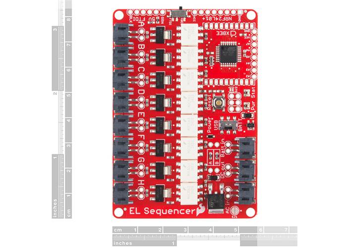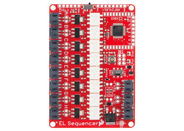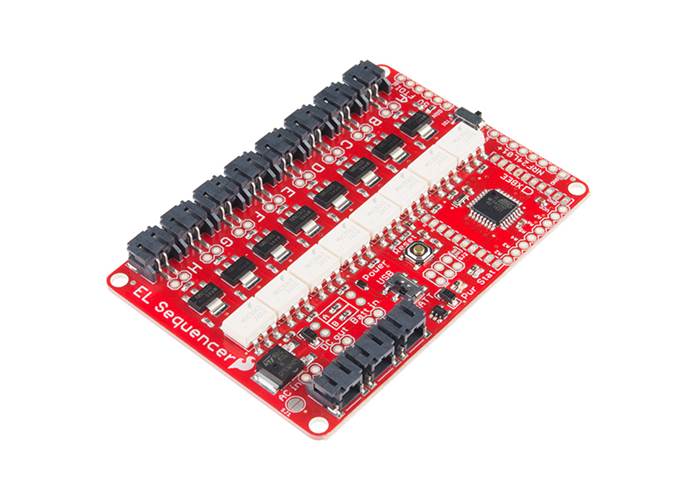 The SparkFun EL Sequencer is a board that contains an Arduino-compatible microcontroller, and circuitry for controlling up to eight strands of electroluminescent wire . EL wire is flexible plastic cord that glows brightly when high-voltage AC is applied to it.