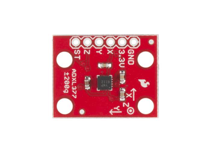 Getting the ADXL377 Breakout set-up is easy. Simply supply the accelerometer with power (3.3V and GND), then hookup the X, Y, and Z lines of the sensor to ADC pins on your chosen development board and you will be good to go. Bandwidths can even be selected to suit the needed application, with a range of 0.5 Hz to 1600 Hz for X and Y axes and a range of 0.5 Hz to 550 Hz for the Z axis.
