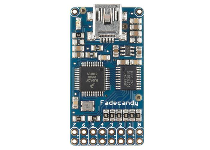 Eight outputs line the bottom of the FadeCandy to provide you with a way to support up to 512 LEDs total assigned to each output in eight strips of 64 LEDs each. Thanks to the firmware each driver utilizes a unique built in dithering algorithm to help in colour correction to make the light from each WS2812 apear and move and fade smoothly.
