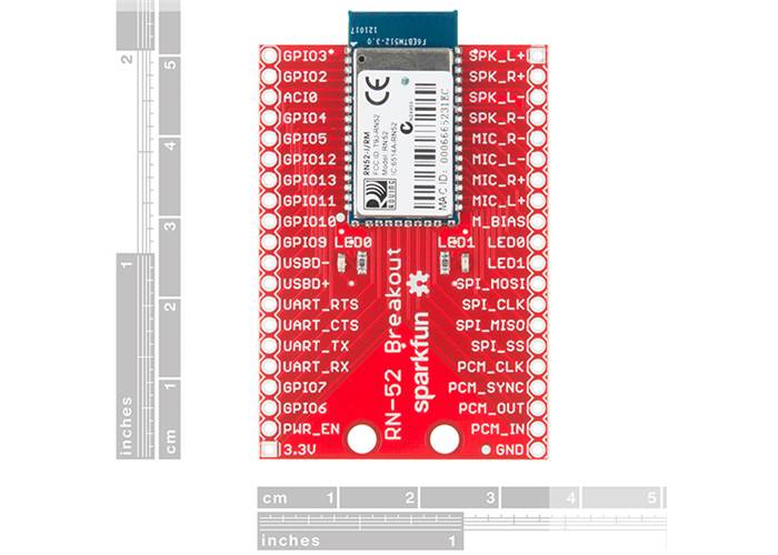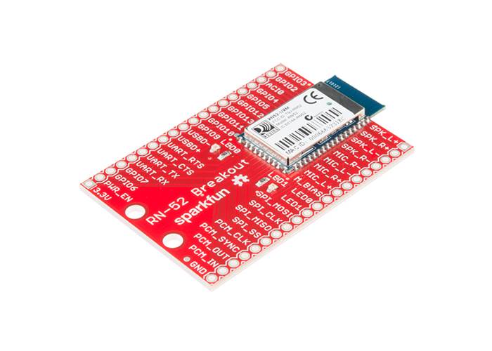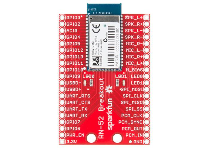The RN-52 Bluetooth from Roving Networks is an audio module that makes it simple for you to create a hands free audio system for your car or remote control your media centre. With this breakout board we’ve made it easy for you to drop it into any project you could use it for. All pertinent headers are broken out and labelled for your convenience.