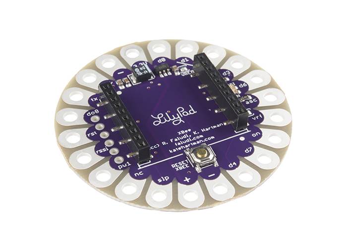 LilyPad is a wearable e-textile technology developed by Leah Buechley and cooperatively designed by Leah and SparkFun. Each LilyPad was creatively designed to have large connecting pads to allow them to be sewn into clothing. Various input, output, power, and sensor boards are available. They’re even washable!