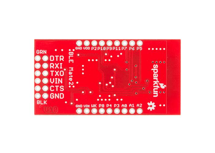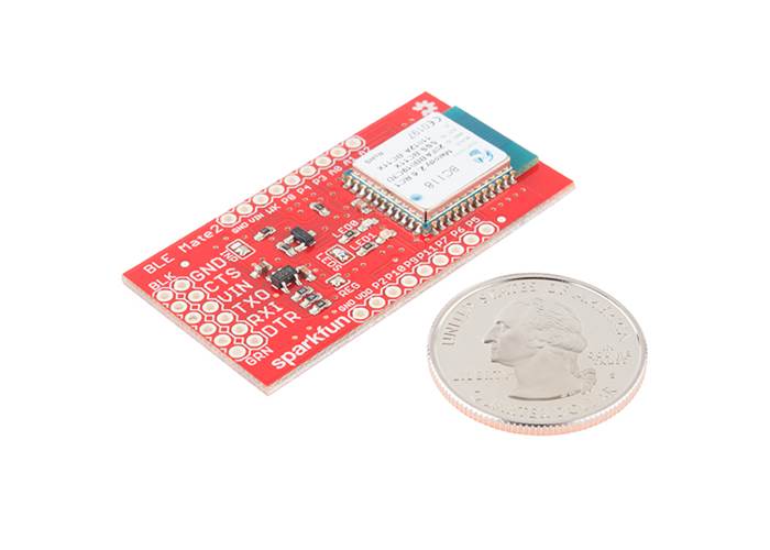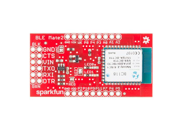 This is the SparkFun BLE Mate 2, an efficient and reliable Bluetooth 4.0 development board. The BLE Mate 2 closely resembles a breakout board, in that nearly every pin on the on-board BC118 module is made available to access. This board is actually a close cousin to our Gold and Silver Bluetooth Mates and functions in a very similar way but, as the name implies, operates as Bluetooth Low Energy instead of Bluetooth 2.0.