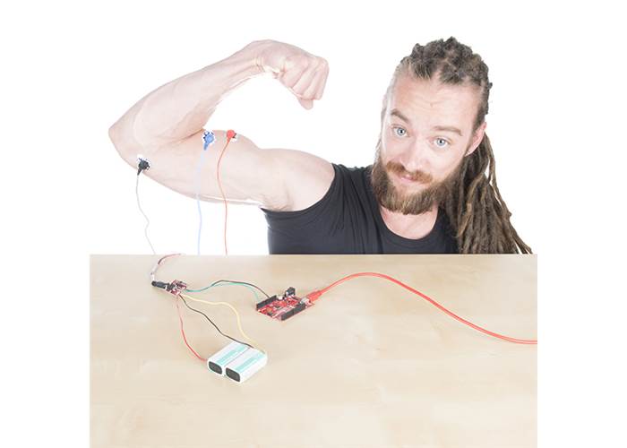 This sensor will measure the filtered and rectified electrical activity of a muscle; outputting 0-Vs Volts depending the amount of activity in the selected muscle, where Vs signifies the voltage of the power source. It’s that easy: stick on a few electrodes (not included), read the voltage out and flex some muscles!