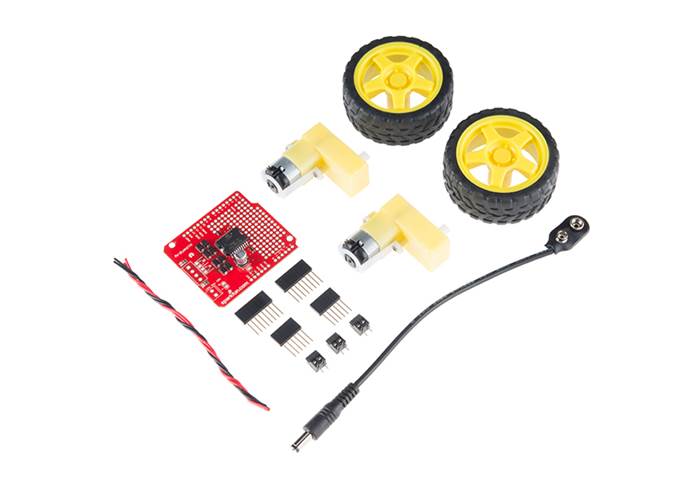 Turn an Arduino Uno board into robot with this Ardumoto shield kit. The kit includes the Ardumoto motor driver shield, two motors and wheels and other little bits needed to make a simple movable robot.