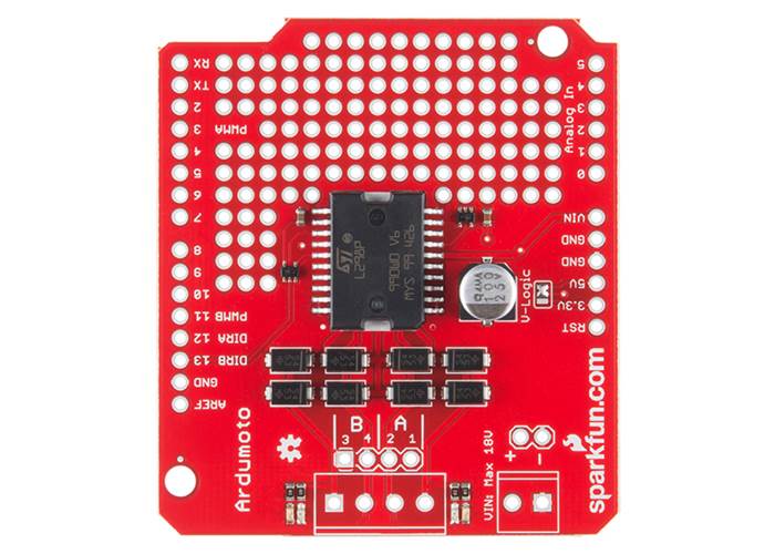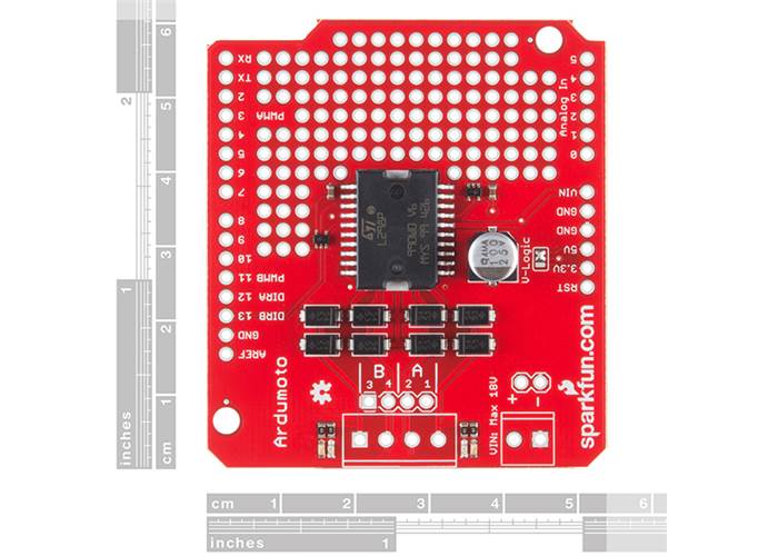 The Ardumoto Shield is an easy-to-use dual motor controller for Arduino. Combined with an Arduino, the Ardumoto makes a fantastic controller platform for RC vehicles or even small autonomous robots. At the heart of the Ardumoto – the big, black chip right in the middle – is an L298, one of our favourite dual-channel motor drivers around, capable of driving up to 2A per channel. The board takes its power from the same Vin line as the Arduino board, includes blue and yellow LEDs to indicate active direction, and all driver lines are diode protected from back EMF.