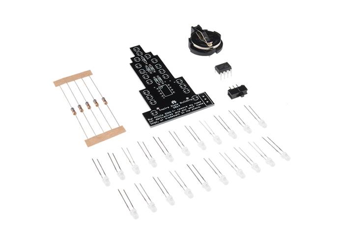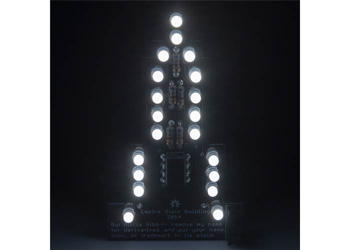 This is the Empire State Blinky Building, a simple PTH soldering kit designed by Alicia Gibb that you will be able to use as a great beginners soldering project or as an example on creating open source hardware derivatives.