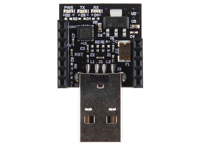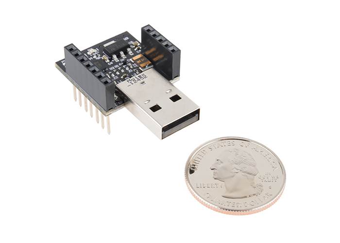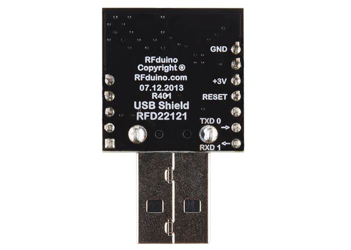 This is the RFduino USB shield, a small add-on board that plugs into any USB port and is used to load your sketches onto an RFduino module. This shield can also be attached to any solderless breadboard with the RFduino DIP plugged on top or even below it for better ease of use. Once your code is loaded onto the RFduino, this USB Shield can be detached!