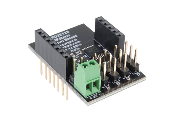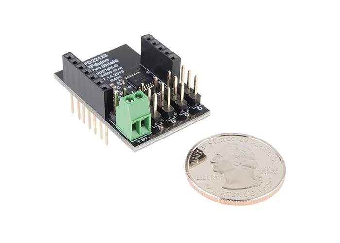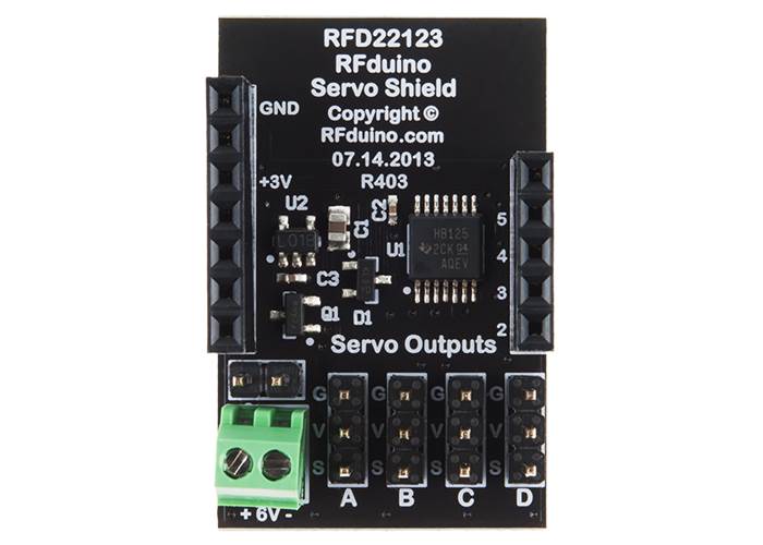 This is the RFduino Servo Shield, a small board that can be used with the RFduino DIP module to drive up to 4 servos at once. This pretty much as small as servo controllers get even when attached to the RFduino DIP board. With this shield and the RFduino Servo iOS app you will actually be able to wirelessly control your servos!