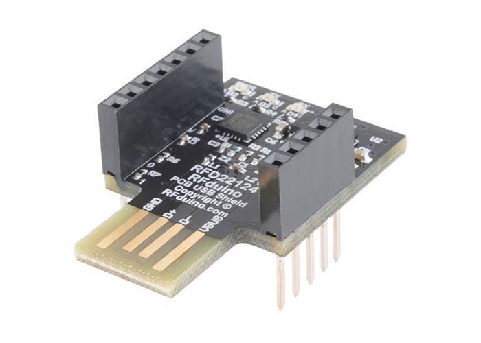 This is the RFduino PCB USB Shield, a small add-on board that plugs into any USB port and is used to load your sketches onto an RFduino module. This shield is almost identical to the RFduino USB Shield and provides the same basic function. The PCB USB Shield can be attached to any solderless breadboard with the RFduino DIP plugged on top or even below it for better ease of use. Once your code is loaded onto the RFduino, this USB Shield can be detached!