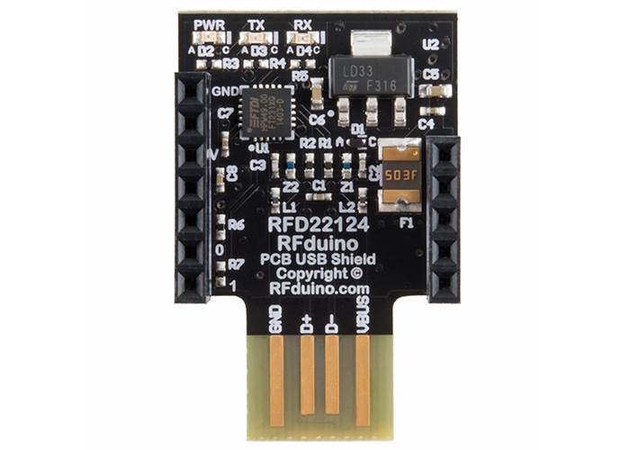 This is the RFduino PCB USB Shield, a small add-on board that plugs into any USB port and is used to load your sketches onto an RFduino module. This shield is almost identical to the RFduino USB Shield and provides the same basic function.