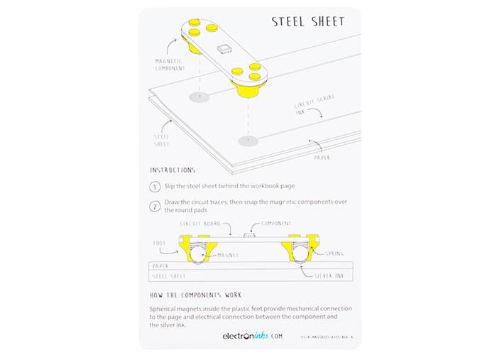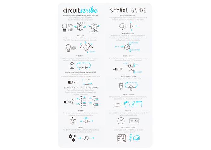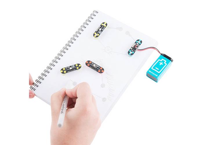 With Circuit Scribe you can draw exactly what you want, no wires or breadboard required. You can build a circuit with nothing but a coin battery, paper clip, and LED, or build out complex circuits with multiple components. The Conductive Ink Pen included in this kit uses a non toxic, silver conductive ink that writes on any surface a regular roller ball pen would with a resistance of 2-10 Ohms/cm. This kit also comes with a workbook full of great project ideas, 11 magnetic electric modules, a 9V battery, and a few other accessories to add to your circuits.