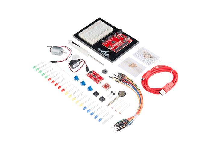The SparkFun Inventor’s Kit for LabVIEW is a great way to add real world connectivity, programming, and hardware incorporation to your LabVIEW projects. The SIK includes everything you need to complete 14 circuit experiments, created in conjunction with the LabVIEW MakerHub, that will teach you how to use the LabVIEW graphical programming environment, read sensors, drive motors, and more. Don’t worry, you won’t need any previous programming or electronics experience to use this kit.